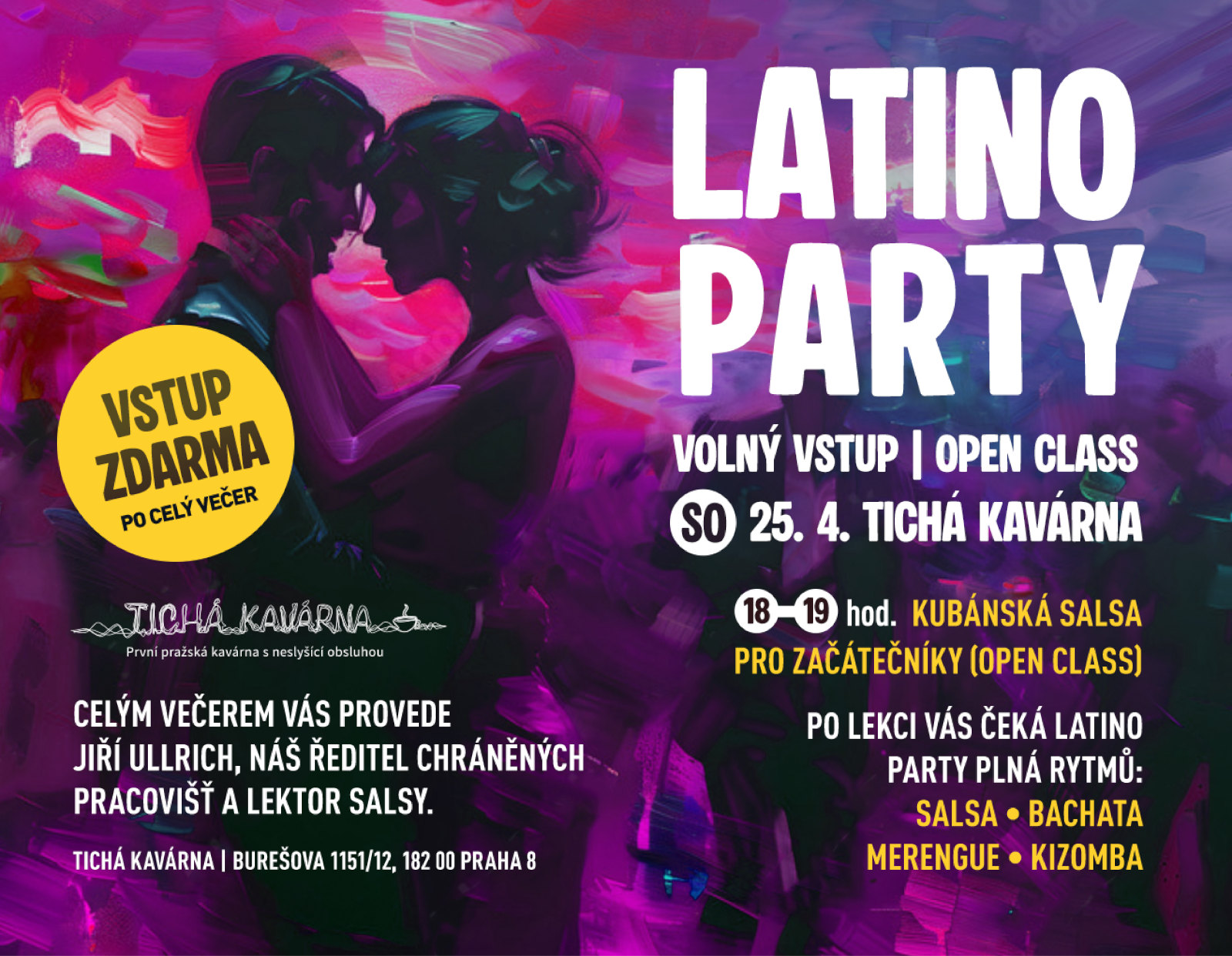 Přijďte do Tiché kavárny na open class kubánské salsy pro začátečníky a navazující latino party. Vstup zdarma.