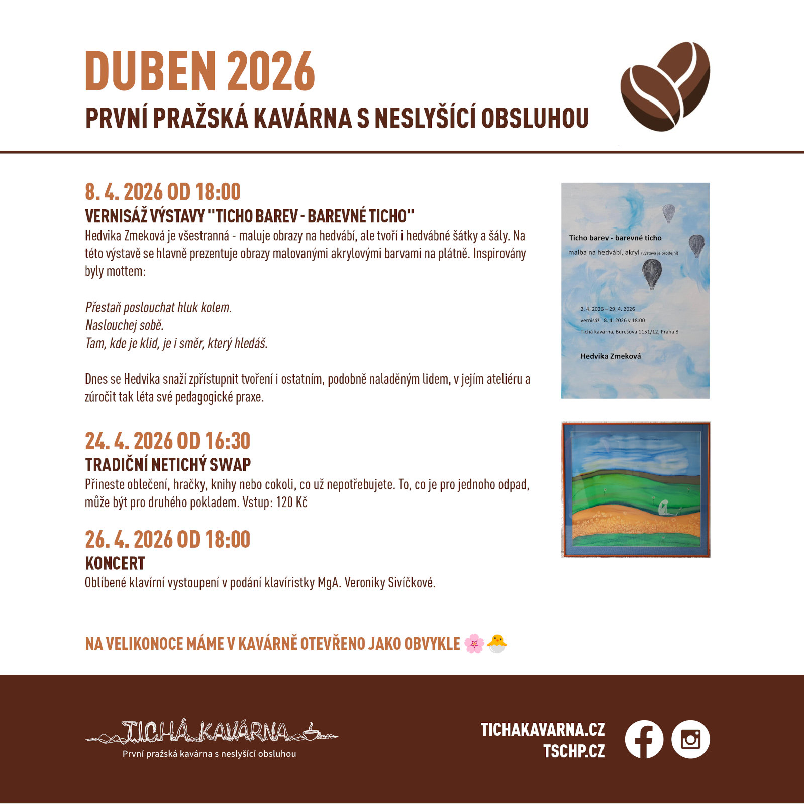 V dubnu nás čeká vernisáž výstavy, tradiční netichý swap i koncert.